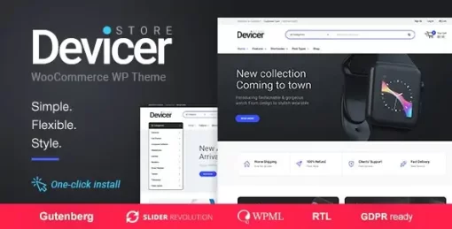 Devicer Electronics Mobile Tech Store Theme is a all-in-one solution for an online digital store or electronics market. A fully integrated and styled Woocommerce shop section, with useful addons lets you create a really powerful electronics, mobile and digital products store. Tech Store theme comes with several ready demo versions, but you can easily build your custom home page, as theme functionality is really huge.