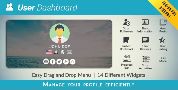UserPro Dashboard offers an easy control over the information and design of user’s profile. The dashboard also enables a quick and single page view to all the details of your profile.